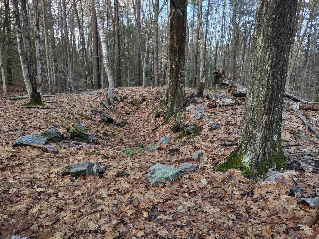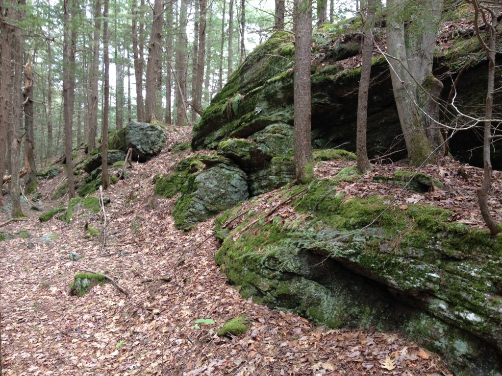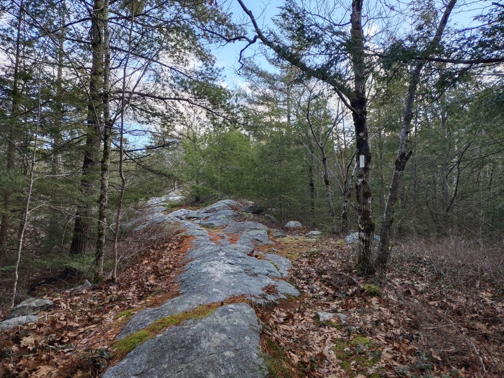 The trail is a small section of the New England Trail (NET) and is blazed white. After a fairly level beginning as it passes the Calvin Swan Homestead Site, it turns left rather than crossing the powerlines into the town forest. The last quarter-mile is a steeper gradient to the top of Brush Mountain.